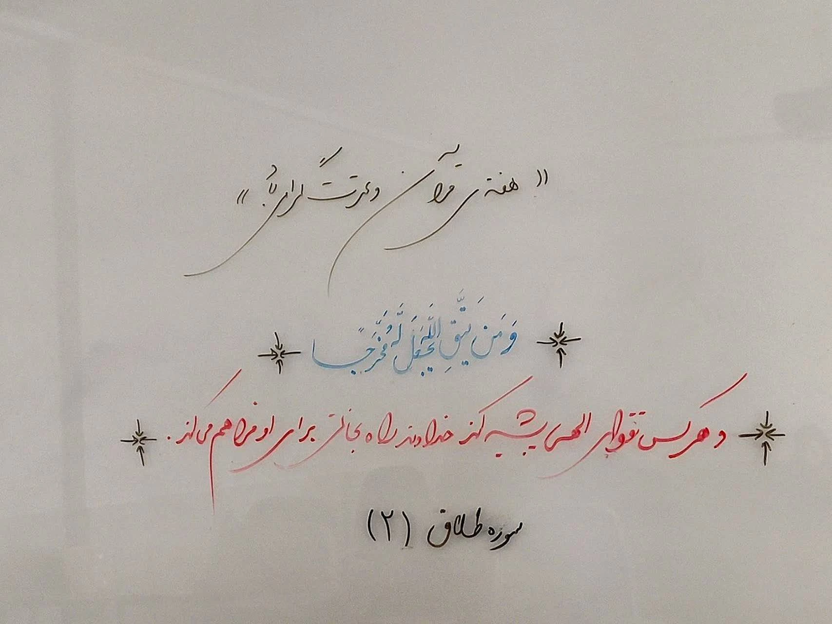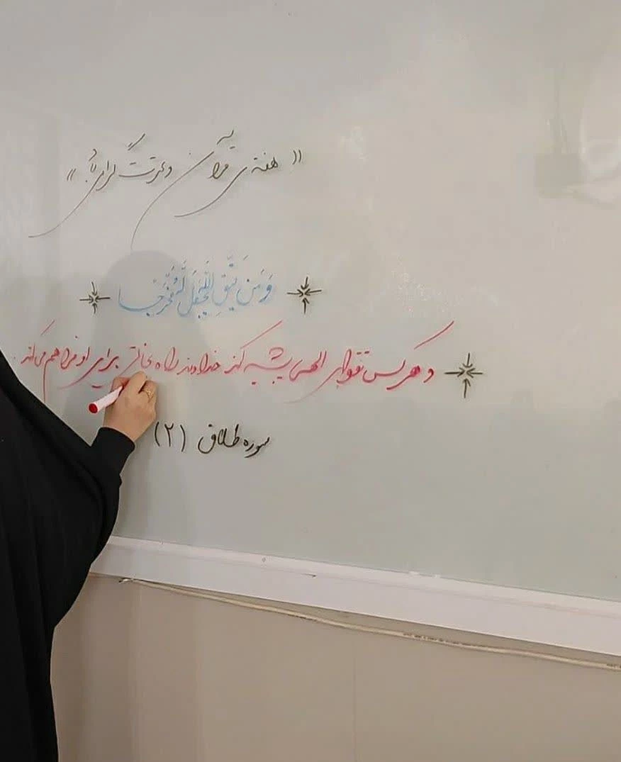 به مناسبت گرامیداشت هفته قرآن و عترت، برنامهای تحت عنوان " روز قرآنی " در دانشگاه فرهنگیان پردیس امام جعفر صادق(ع) برگزار گردید که در این برنامه، دانشجومعلمان هر کلاس، یک آیه از قرآن کریم را به همراه ترجمه آن، روی تابلو کلاس به نگارش درآوردند و کلاس خود را با برکت خواندن قرآن و تدبر در آیات آن آغاز نمودند.