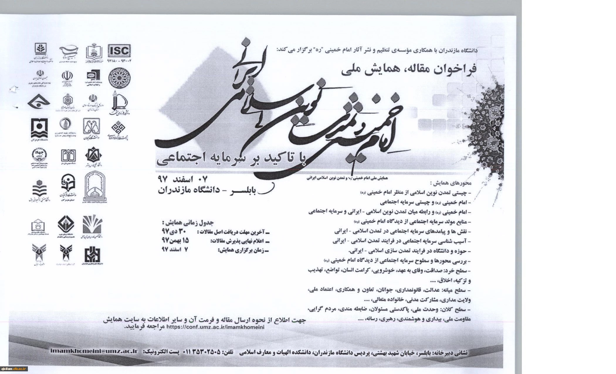 امتیاز دهید : فراخوان همایش ملی امام خمینی و تمدن نوین اسلامی-ایرانی با تأکید بر سرمایه اجتماعی چهارشنبه 26 دی 1397 ساعت 8:08