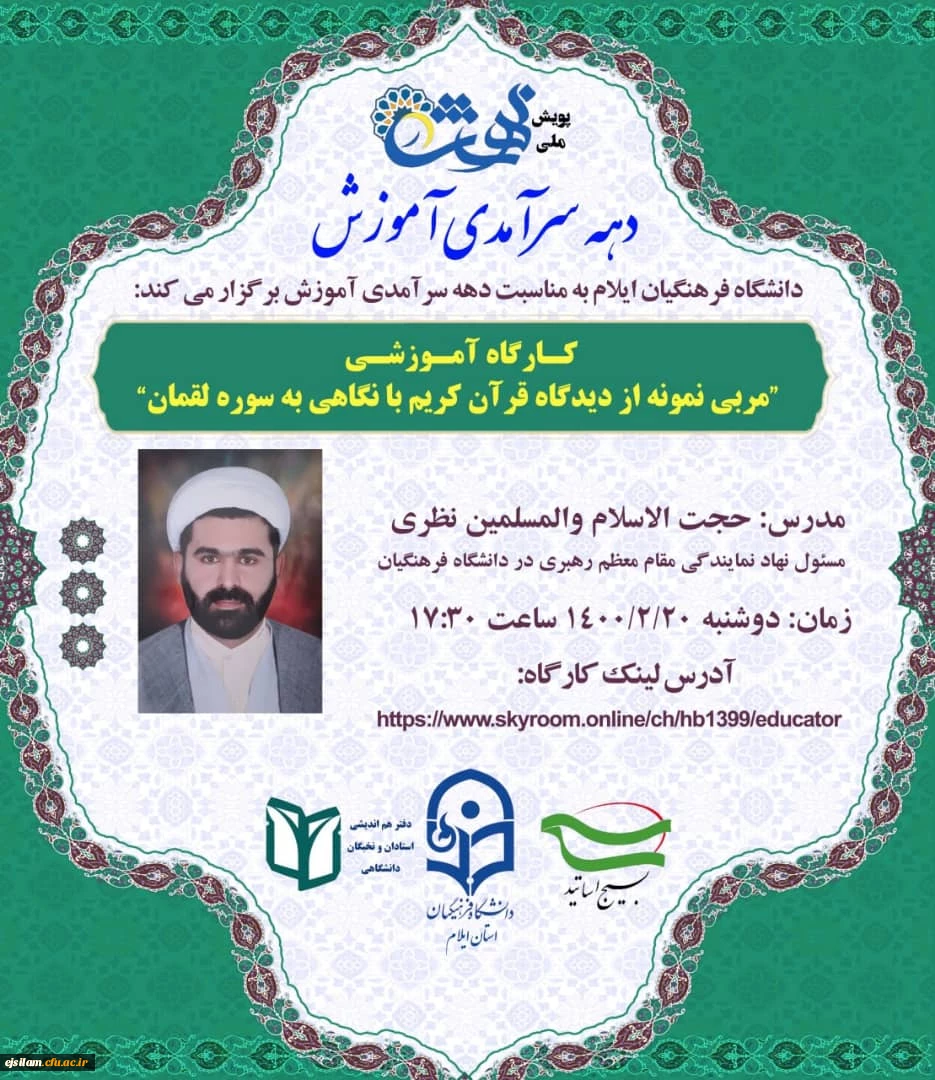 امتیاز دهید : کارگاه آموزشی مربی نمونه از دیدگاه قرآن کریم با نگاهی به سوره لقمان یکشنبه 19 اردیبهشت 1400 ساعت 11:15